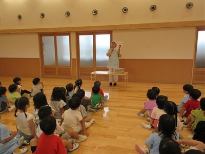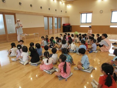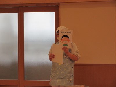 3クラス合同で栄養士さんから“よく噛んで食べる”大切さについて話を聞きました。