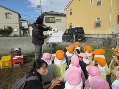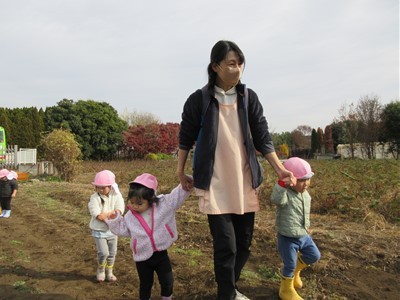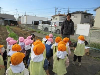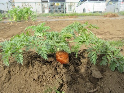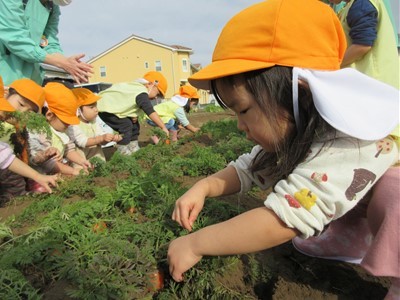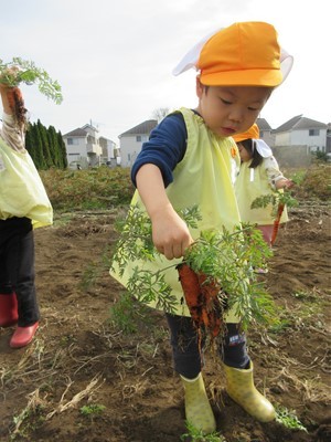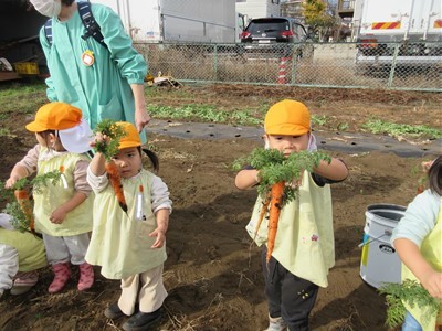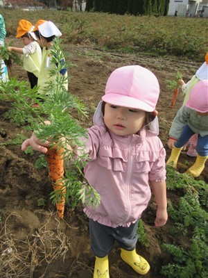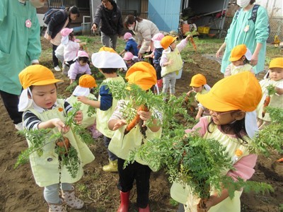 にじ組さん、ひよこ組さんが園バスに乗って人参の収穫に行ってきました。