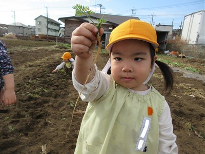 葉っぱの根本を持って引っ張るよ~と教えてもらい「よいしょ~!」と引っ張ると…スルッと人参が顔を出し、子どもたちはにこにこ(*^-^*)