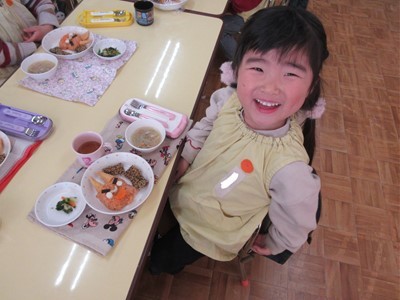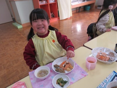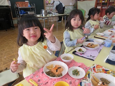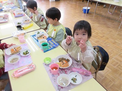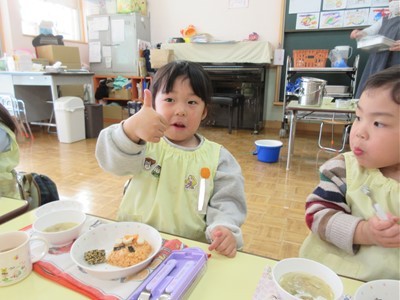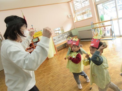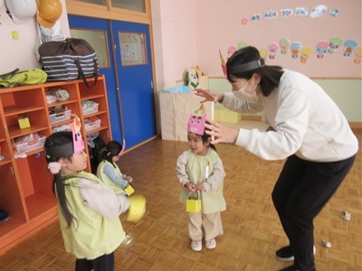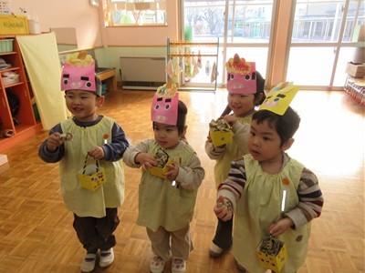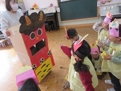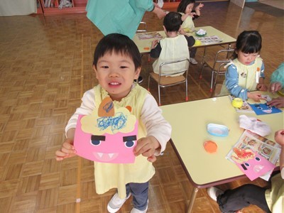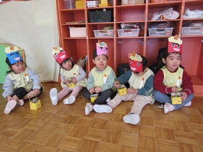 当日の豆まきでは「おには~外!!」と元気いっぱい楽しみ、節分メニューの給食ではチキンライスの顔にとんがりコーンの角やソーセージの目などを自分でつけて仕上げると色々な表情のおにができました!!自分で仕上げた赤おにライスの美味しいこと♡みんなペロリと食べていました♩