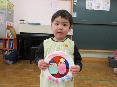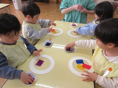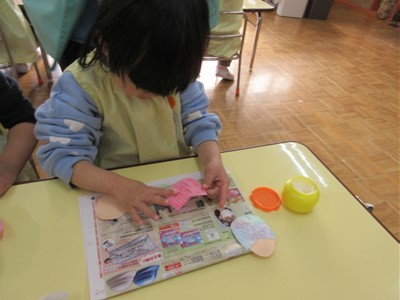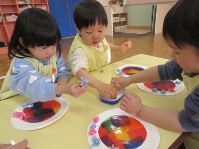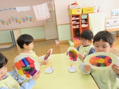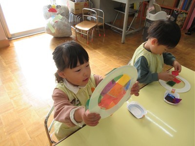紙皿にセロファンを貼っていくと、光に透けるステンドグラス風になり「わぁ~!」と、大喜びでした(*^-^*)