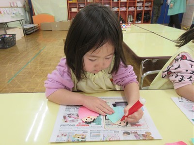 染紙あそびで色がにじむ様子を楽しみながら、おひなさまを作りました。