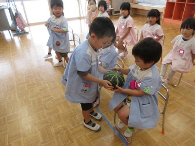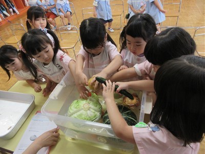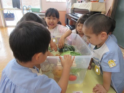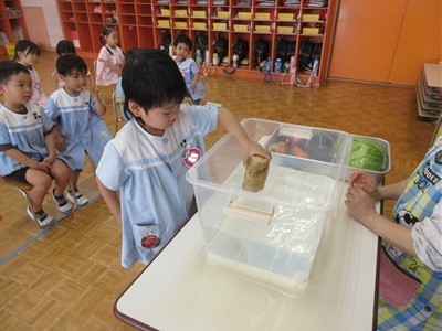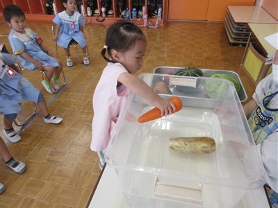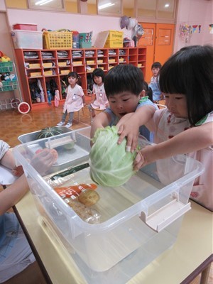 「赤くて丸いのはな~んだ」や「長くて緑色の野菜?」の問いかけに元気よく答える子どもたち。また、水に野菜を入れて浮くかという実験では「キャベツ大きいのに浮かんだ!」「じゃが芋と人参は沈んじゃったね」と不思議そう( *´艸`)